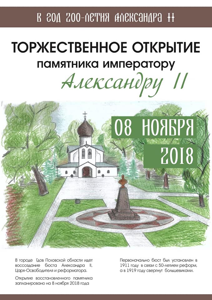 Друзья, сегодня обращаюсь к вам с необычной просьбой. В моём любимом и родном Гдове решили восстановить памятник Императору Александру II, царю-освободителю, разрушенный в 1919 году и облагородить территорию Гдовской крепости.