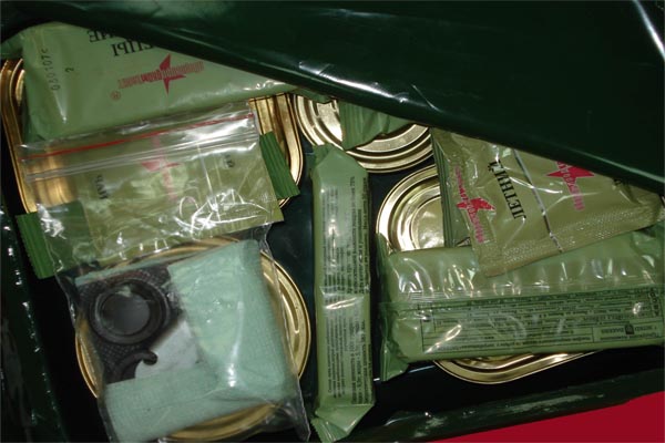 • Количество продуктов питания зависит от продолжительности действий и индивидуальных особенностей солдата. Количество продуктов на один день примерно составляет 1 банку консервированного мяса, 20 граммов риса и 2 плитки шоколада.
