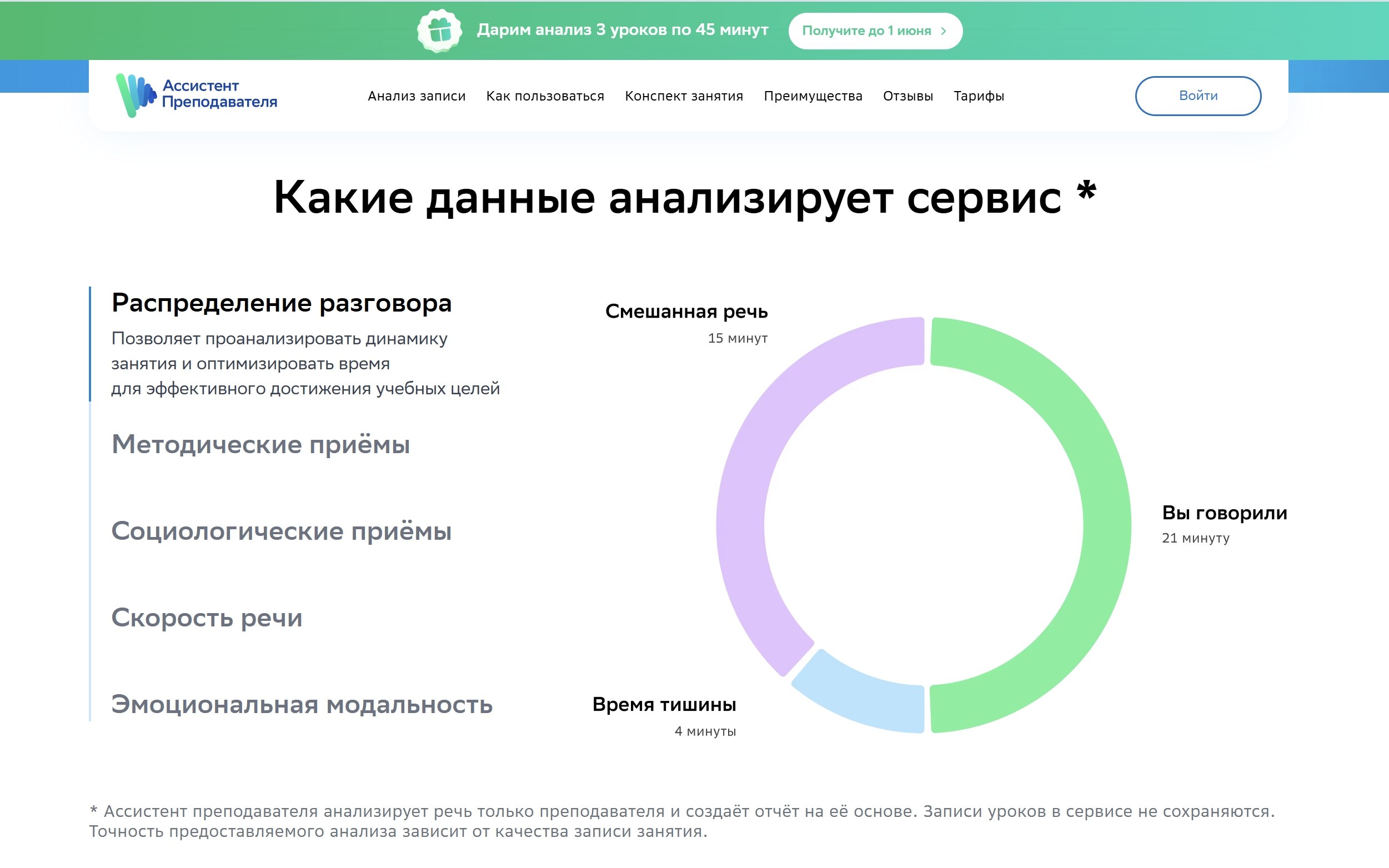 https://edu-assist.me) прямо указано, что он анализирует распределение разговора, методические приёмы, социологические приёмы, скорость речи, эмоциональную модальность. То есть речь идёт не о техническом инструменте вроде электронного журнала или диктофона. Речь идёт о попытке оцифровать саму профессию педагога: как он говорит, как держит класс, как выстраивает урок, как эмоционально воздействует на аудиторию и как управляет вниманием учеников.