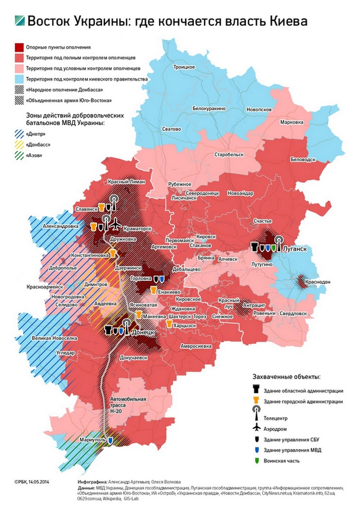 Дабы немного вернуть людей в реальность на скорую руку намалевал карту. Точность конечно условная, ввиду манеры контроля территории воюющими сторонами, но смысл думаю понятен.