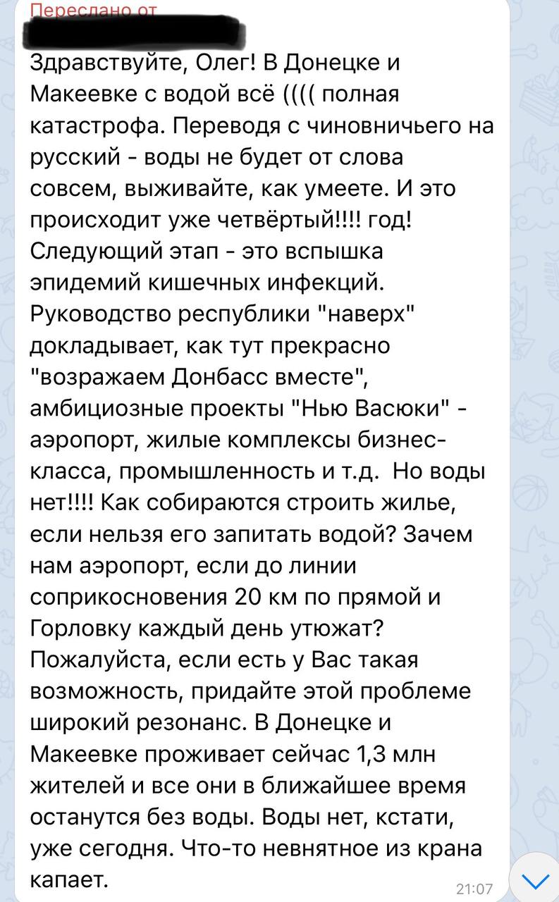 Получил такое обращение. Снова крик души из Донецка. Столица Донбасса и окрестности снова остались без воды.