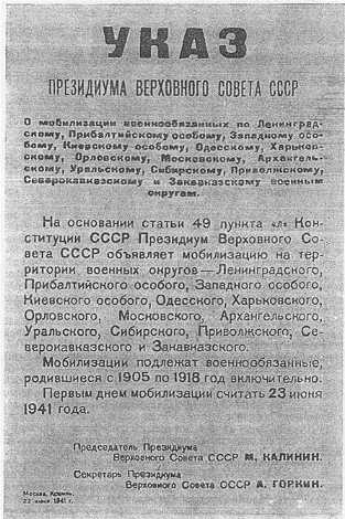 В 1985 году вышла книга: "Великая отечественная война. Энциклопедия" Москва, 1985, 500 тыс. экз. На странице 452 пpиводится фотокопия листовки с Указом о мобилизации. "Пеpвым днем мобилизации считать 23 июня." Странный указ. Немцы напали на рассвете 22 июня, каждая минута на счету, а мобилизацию в СССР назначили на следующий день. Но ещё удивительней дата этого указа. Она пpосматpивается на копии нечетко - то ли 13, то ли 19 июня. Hо точно не 22.