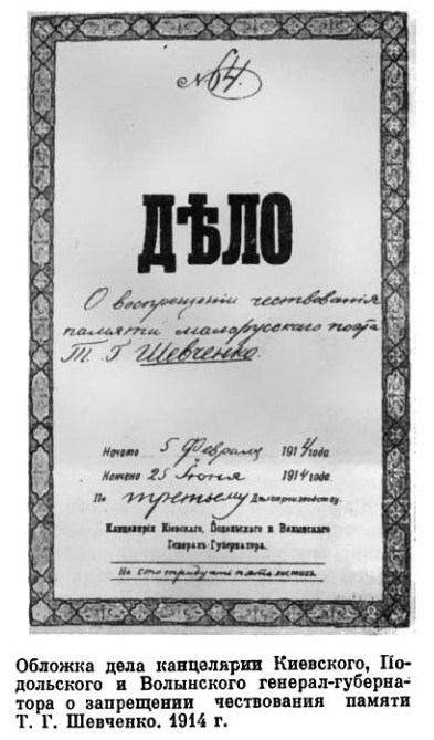 "В годы реакции царизм еще более усилил национальный гнет. Правительство запретило преподавание на украинском языке в тех школах, где в период революции он был введен явочным порядком. Оно отменило циркуляр министра просвещения 1906 г., разрешавший учителям на уроках «использовать малороссийский язык для разъяснения того, что ученики не понимают». В мае 1908 г. правительство отклонило внесенный в Думу законопроект о разрешении преподавать на родном языке «в начальных школах местностей с малороссийским населением». Учителям запрещалось разговаривать с учениками на украинском языке даже вне школы. Ученикам снижались оценки за ответы на украинском языке. В школах не разрешалось петь украинские песни, декламировать стихотворения и даже исполнять национальные мелодии. Комитет по делам печати запретил употреблять в публикациях названия «Украина», «украинский народ», лживо квалифицируя их как «совершенно чуждые» народным массам. Ко всем украинским пьесам цензура применяла одну стереотипную резолюцию «К постановке не разрешено». Как правило, запрещалось проведение публичных вечеров, посвященных памяти Т. Г. Шевченко. Царские власти запретили и сбор средств среди населения Украины на сооружение памятника на его могиле в Каневе. Правительство усилило борьбу против национальных культурно-просветительных организаций, возникших во время революции. Насильственно закрывались украинские клубы, научные общества и т. п. Такая судьба, в частности, постигла киевскую, одесскую, черниговскую, полтавскую, нежинскую и другие «Просвиты»... Власти не оставили без «внимания» и украинскую прессу. В 1907 г. из 18 периодических украинских изданий осталось всего девять. В течение следующих лет их количество еще уменьшилось. Активными противниками распространения периодической печати на украинском языке выступали черносотенцы."