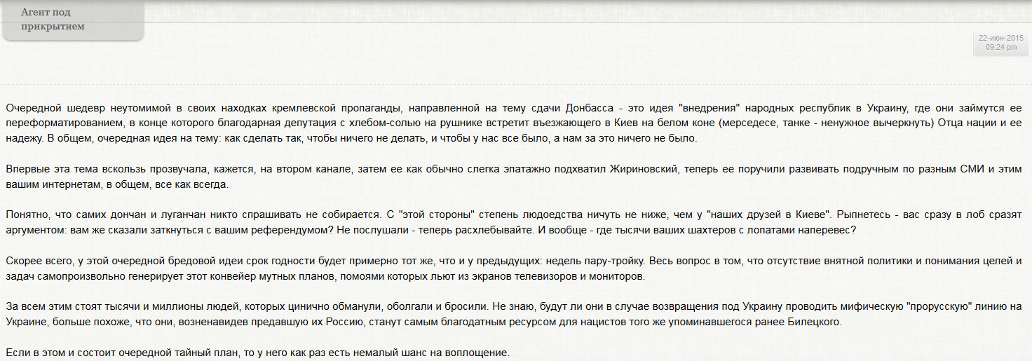 И. С.: Если я сейчас возьму бумагу и напишу, что распоряжаюсь сформировать два боеспособных корпуса, от этого у меня два корпуса не появятся. Да, осенью Армия Новороссии была более боеспособной чем ВСУ, а сейчас все не так. Дождались, допримирялись — «Минск-1», «Минск-2»… Украина времени не теряла. Кроме того, ресурсы Украины, даже людские, во много раз превышают ресурсы Донбасса — у противника просто тупо больше людей. Даже если каждому жителю Донецка и Луганска выдать по танку, население не превратиться в танковые корпуса. Для военного это совершенно ясно.
