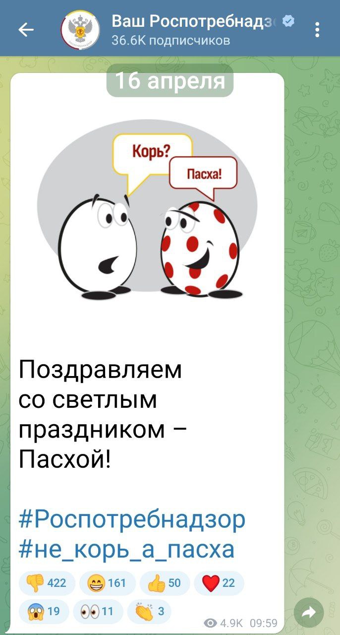 Роспотребнадзор (https://t.me/rospotrebnadzor_ru) поздравляет вас, русские люди, со светлым праздником Христова Воскресения.