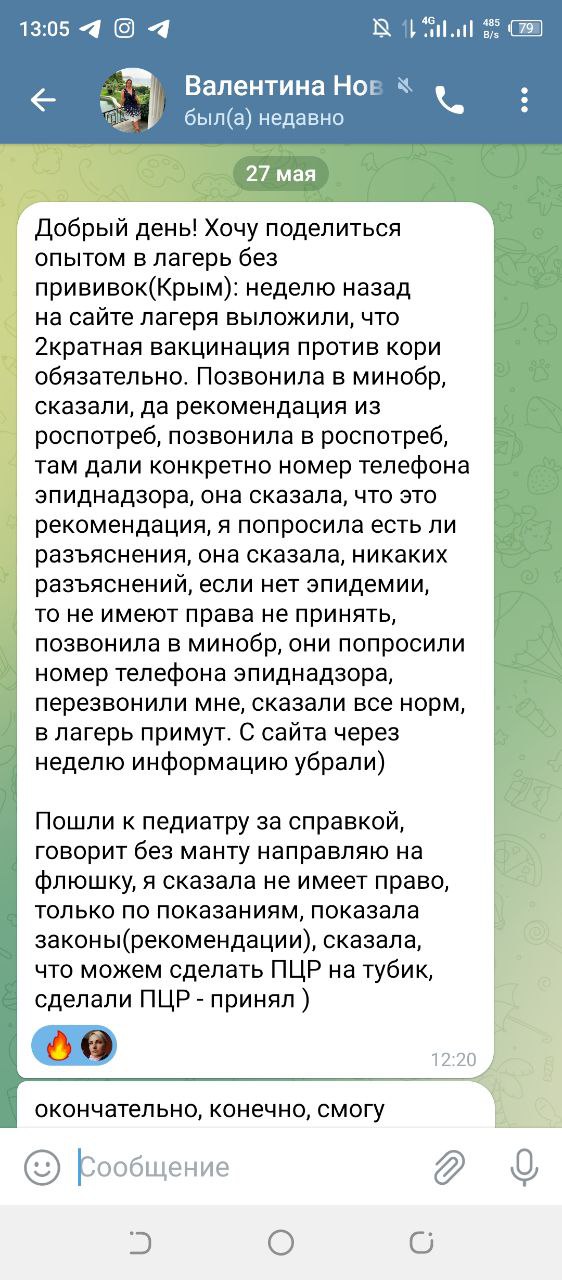 Путем нехитрых манипуляций, девушка двумя звонками решила проблему обязательности прививок от кори и кое-каких тестов для допуска в лагерь.