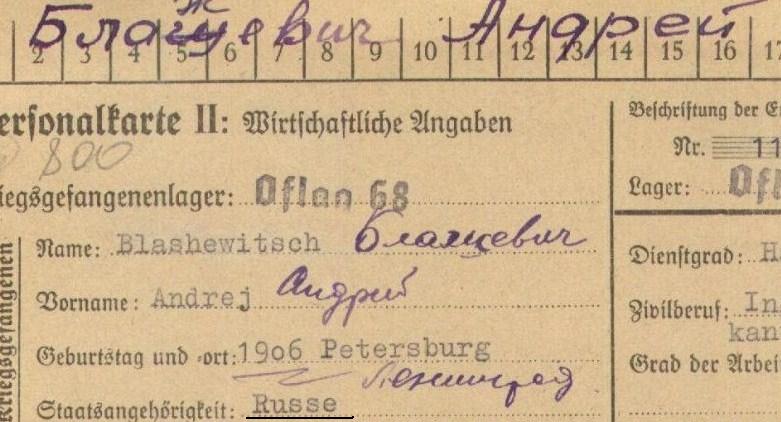 Документ на Андрея Блажевича. Немецкий, из лагеря. Национальность - русский.