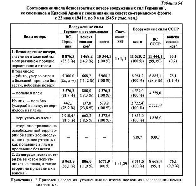 ...реальные безвозвратные потери наших войск составляют около 11,5 млн. чел. Это больше, чем по Кривошееву, но куда меньше, чем у брехунов вроде Солженицына и Соколова.