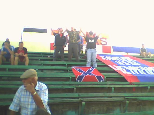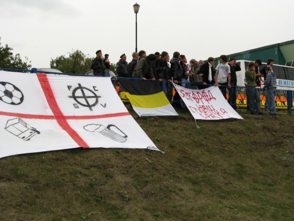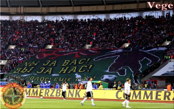и вот такие вот позорные баннеры(((((((((с полного одобрения гос-на мутко,авторами данной тряпки является организация-воб(Всероссийское Объединение Болельщиков).Организация не пользуется уважением среди фанатов.Очень четкий пример как опасен прямой контакт власти и "фанатов" для последних.