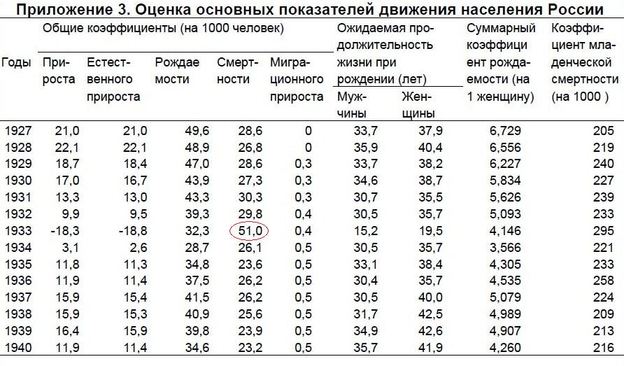таблицы видно, что ожидаемая продолжительность жизни в советской России в 30-е гг. была такой же, как и в царской России в конце 19 века. А иногда (в 1931-1934 и 1936-1937 гг.) даже ниже, чем в РИ.
