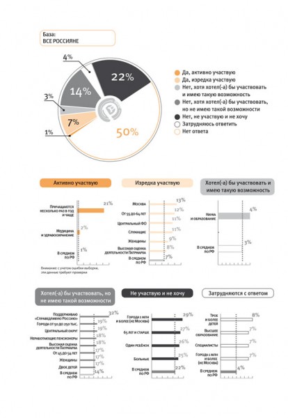 Повторюсь, предъявленные таким образом результаты вызывают больше недоумений. Поскольку можно легко предположить, что при виде этих данных, первой реакцией людей может быть такая: «раз только 1% населения участвует, значит, во-первых, православных столько и есть, и, во-вторых, это для страны вещь незначимая и помогать им не стоит, участвовать в этом не стоит». Но поменяй авторы формулировку вопроса, например, на: «Принимали ли Вы участие в таких-то и таких-то видах деятельности, организованных храмом?» Или: «Есть ли у Вас знакомые люди, регулярно ходящие в церковь?». И добавить к этому: «Если бы они попросили бы Вас помочь в том-то и том-то, Вы бы согласились?»… Результат был бы иным.