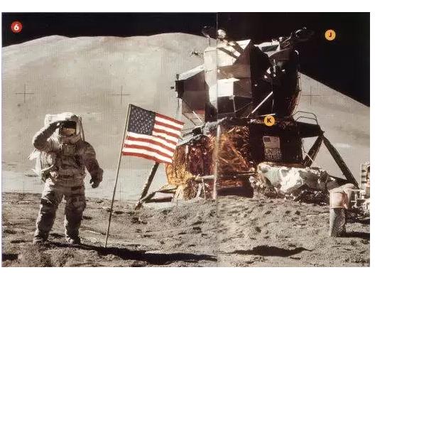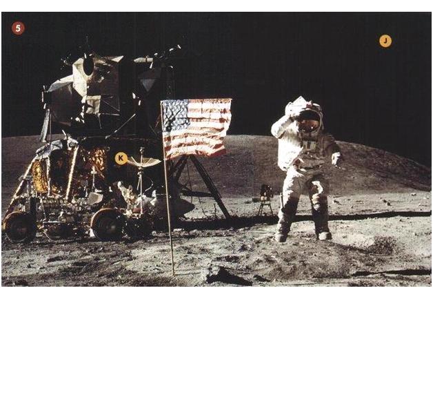 Комментарий к файлу: Эти фотоснимки со Жоном Юнгом и Жамесом Ирвином—подобно многим другим фото Аполло—показывают лунное небо без звезд (J). Но так как на Луне нет атмосферы, то звезды должны быть видимы,—факт, который подтвердила Мария Близински, Куратор Астрономии во Гринвичской Обсерватории, Лондон. Очевидно, американцы не надеялись достоверно воссоздать лунное небо со звездами, поэтому они просто остановились на черном фоне. Америка утверждает, что солнечный свет-де был столь силен, что затмил свет от звезд. На теневой стороне приземленных Модулей имеются таблички (К) со юэсовским флагом и словами “United States”, ярко освещенными и ясно видимыми, но позолоченная фольга вокруг табличек есть почти во полной темноте. Такой эффект мог быть получен только при помощи прожекторов в студии или техниками, которые ретушировали снимки.