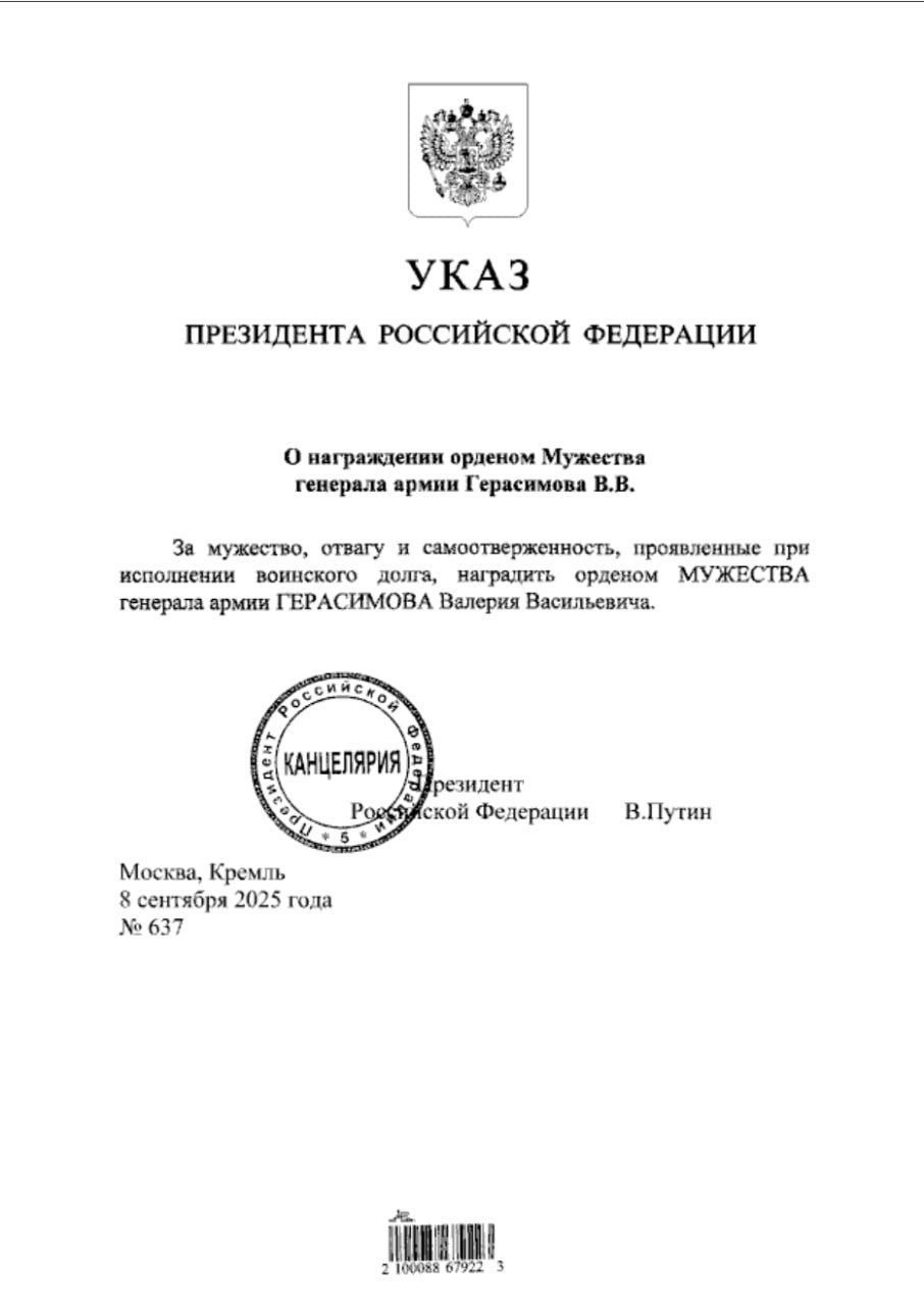 Герасимову дали Орден Мужества. Уж не за доклад ли о "ДРГ,которая вторглась в Курскую область"? (черный юмор) А потом удивляются когда некоторые бойцы отказываются от гос.наград...