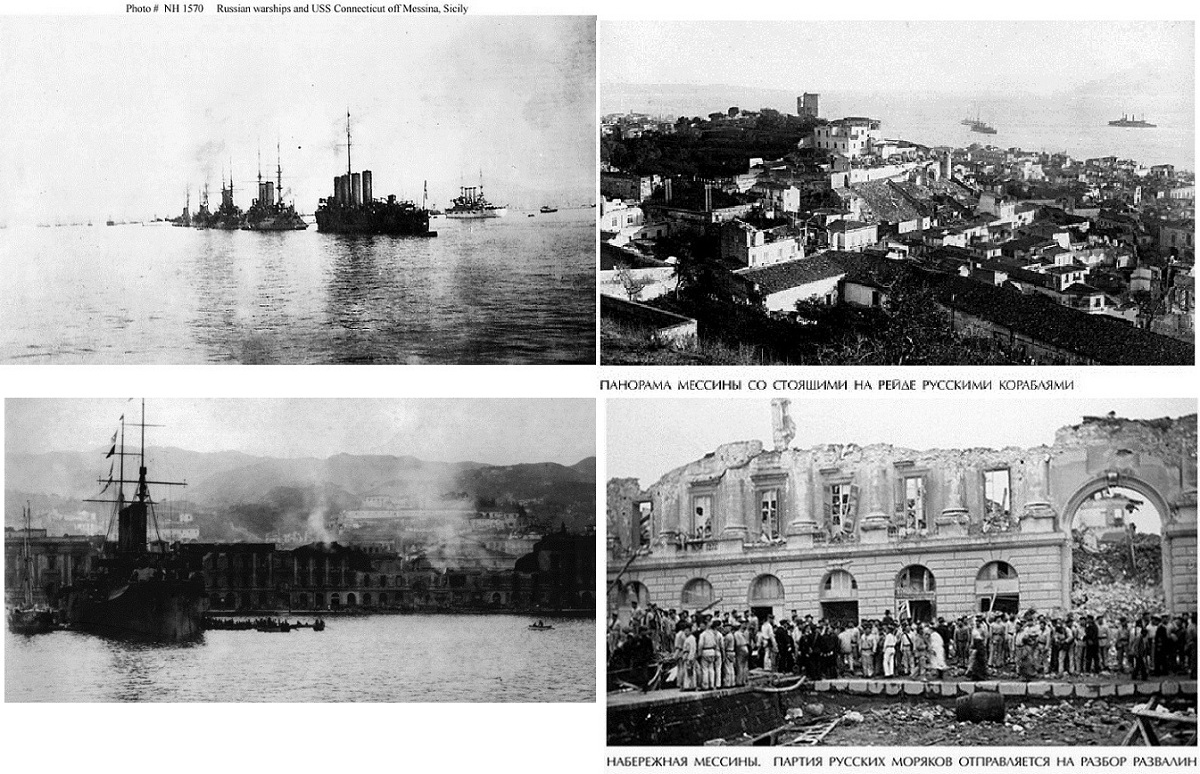 В течение первых трёх дней только от русских моряков получали обезумевшие жители пищу-хлеб,кашу и воду.На берегу были организованы перевязочные пункты,оказывавшие первую помощь.Спасённых людей клали на носилки или на створки дверей и несли на набережную к медпунктам,а после отправляли на корабли,где в лазаретах были развёрнуты операционные.В первый же день раскопок спасённых разместили на трёх русских кораблях.Они немедленно ушли в Палермо,Сиракузы,Катанию.На второй день линкор "Слава" ушёл в Неаполь,взяв на борт 550 раненых женщин и детей.В порту "Слава" была встречена рукоплесканиями и возгласами: "Да здравствуют русские моряки! Да здравствует Россия!" Из Неаполя корабль снова возвратился в Мессину,где продолжались спасательные работы.Горький,живший в ту пору на Капри,выезжал в Мессину вскоре после катастрофы,провёл там несколько дней и записал рассказы очевидцев.Вот один из них: "На остатках балкона,зацепившись рубашонкой за изломанную решётку,висит девочка лет шести.Только половина тела её на обломках,а голова и грудь-в воздухе; девочка молчит и смотрит вниз.Снять её невозможно: обломок стены едва держится...Матросы словно акробаты.Они ставят лестницу,не касаясь ею стены,на вершину лестницы взбираются двое,один садится верхом на плечи другому и,распрямив своё тело,снимает девочку.Это было сделано так ловко,что среди стонов,боли и криков о спасении раздался,может быть,неуместный,но неудержимый крик победы и радости". За пять дней русские моряки спасли около 2,5 тысячи человек.Всего в спасательных работах в Мессине участвовало около 3 тысяч матросов,гардемарин и офицеров.В следующем 1909-м крейсер "Аврора" посетил Мессину и,вернувшись в Россию,доставил всем морякам-спасателям медали,отчеканенные итальянским правительством в память о землетрясении 1908-го года"