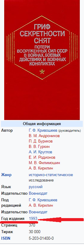 Ну и дела! Ты эту книгу видел в 93 году? Была ли она в свободной продаже? Помню, примерно полгода назад этот бородатый еврей из знатоков рассуждал по ТВ, что потери 6-7, что учет одного и того же мог дублироваться. Оказывается, еще в 93! Ну как все схвачено.