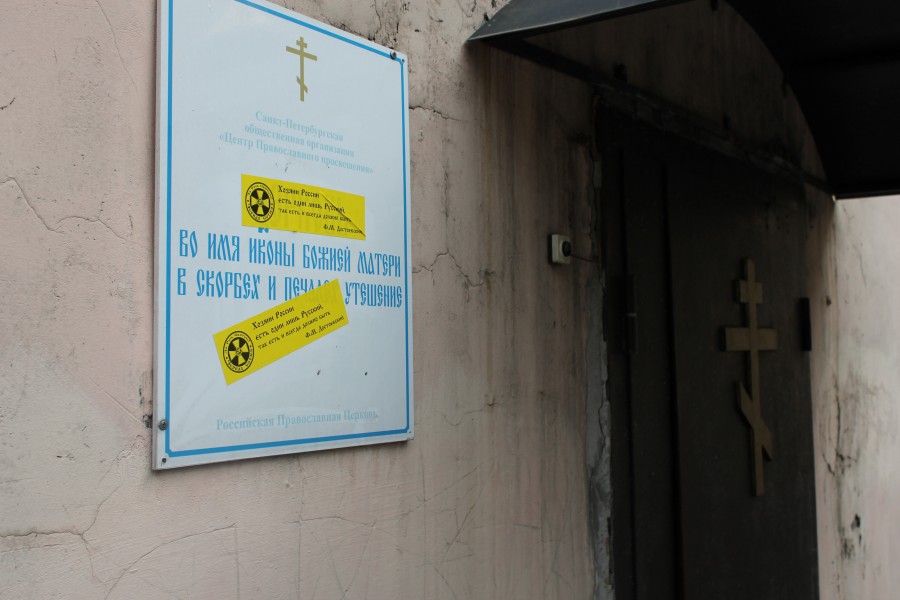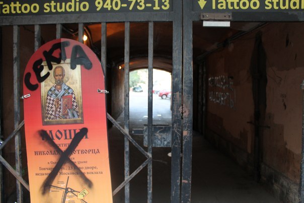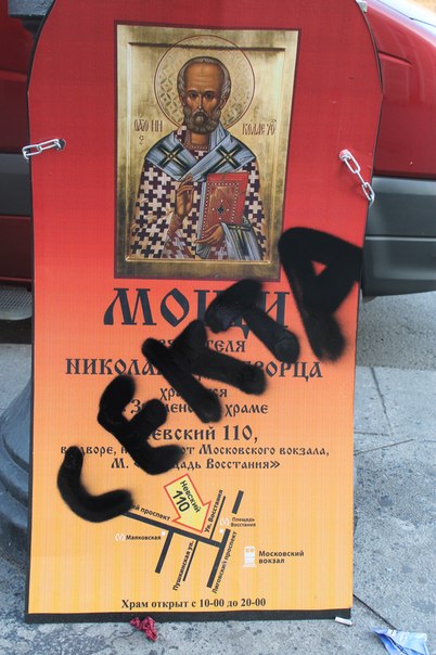 Рекламные щиты на Васильевском острове и "церковь" в районе Площади Восстания.Использование баллончика с краской и нанесение антисектантских надписей. Ссылка на пост в главном паблике "Черной Сотни" в социальной сети В Контакте http://vk.com/chernosotnia?w=wall-29062072_5746