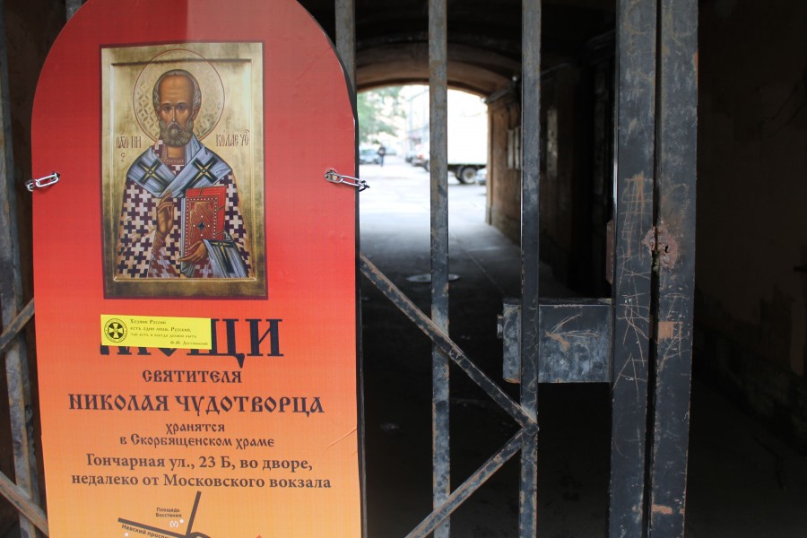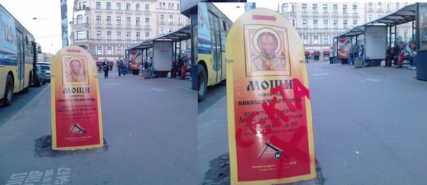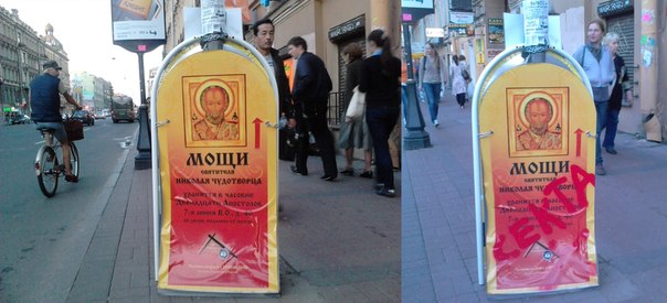 1. На протяжении 5 лет на центральных улицах Санкт-Петербурга ими массово размещаются запрещенные рекламные конструкции (раскладные щиты, так называемые «Стритлайны»), сообщающие о якобы прибытии в город мощей св. Николая Чудотворца и приглашающие поклониться им в одной из 6 «часовен», находящихся во дворах жилых домов в центре города и принадлежащих злоумышленникам. Пришедшим предлагается заплатить по 3 000 рублей «за сорокоуст».