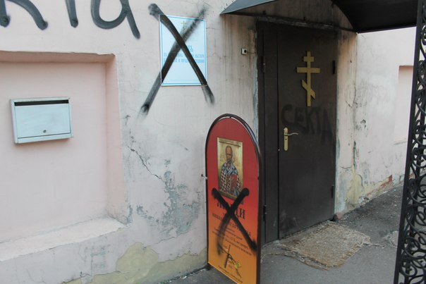 К сожалению,антисектантские надписи были оперативно стерты и закрашены.На фотографиях видны следы.