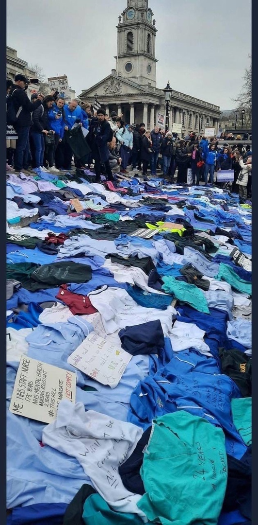 ЛОНДОН - В субботу 22.01 в центре Лондона прошла масштабная демонстрация за свободу выбора и против принуждения к вакцинации (в частности - против принуждения работников мед сферы, так как врачи и медсестры - теперь единственные, кому в Великобритании в обязательном порядке предписаны прививки от Ковид для сохранения работы). На Трафальгарской площади сотрудники системы здравоохранения оставляли свою больничную униформу в знак протеста против принуждения к мед вмешательствам.