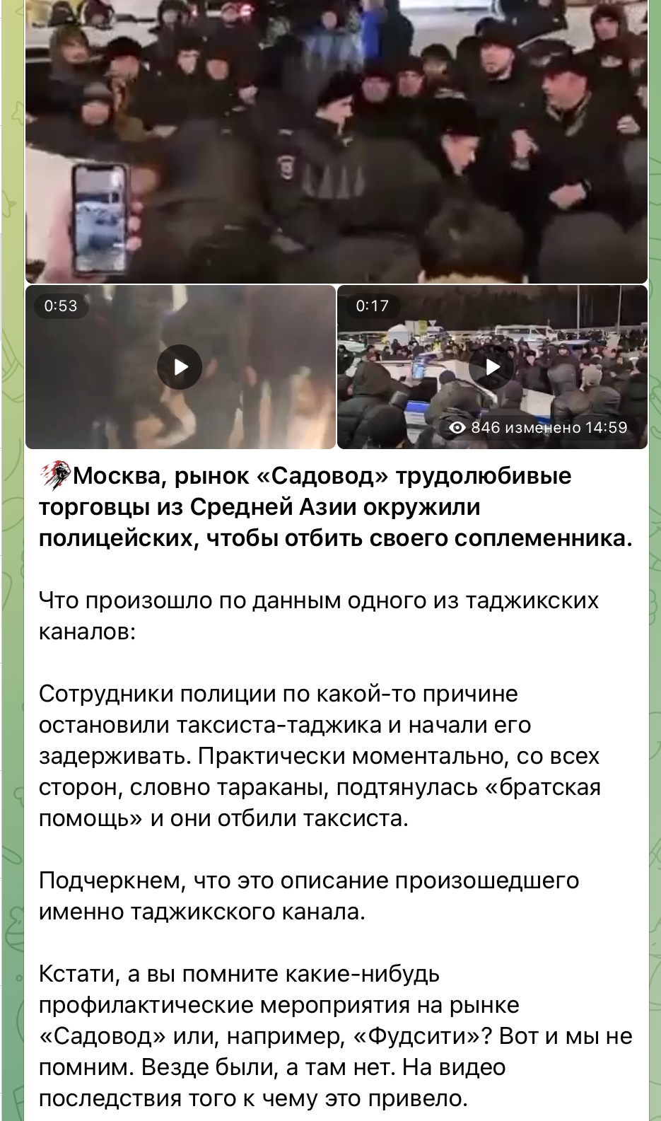 В России открыто действуют этнические организации , с своими чатами и мониторингами для помощи своим землякам, которые могут в момент собирают сотни и тысячи исламистов, и такими толпами они нападают на русских.