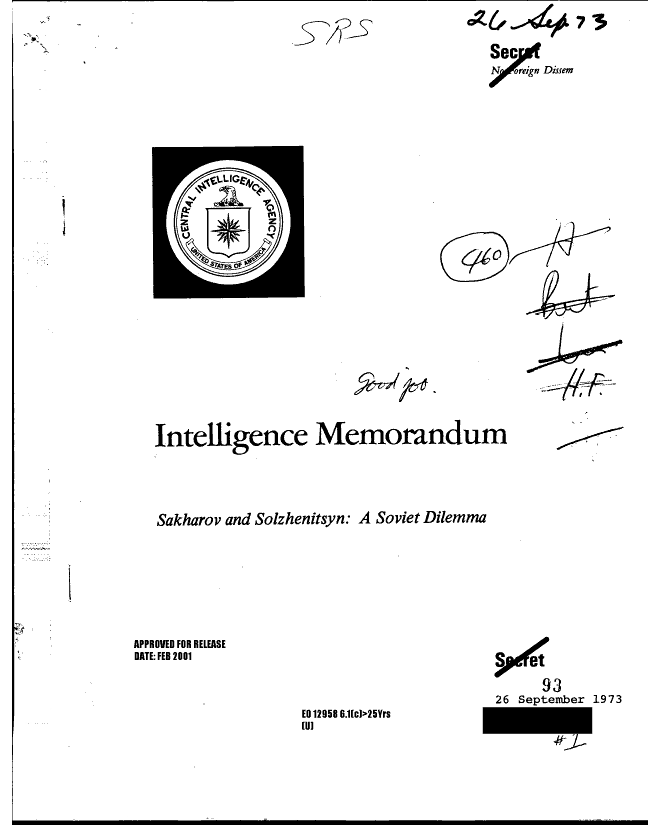 2.Фото рассекреченного документа ЦРУ,где отражена заинтересованность США советскими диссидентами Сахаровым и Солженицыным.