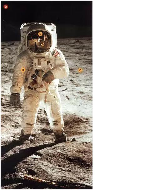 Комментарий к файлу: Бузз Алдрин стоит когда солнце светит вниз через его левое плечо. Хотя его правя сторона есть во тени, на этой стороне его скафандра есть слишком много подробностей (В). Она должна быть гораздо темнее и менее видимой потому что контраст света и тьмы на Луне гораздо сильнее. Так как на Луне нет атмосферы, искажающей свет, все фотографии должны выглядить яркими и резкими. Но пейзаж позади Алдрина (С) постепенно превращается в темноту. Такого эффекта постепенности не должны быть на Луне. На забрале у Алдрина отражен любопытный предмет (D). Некоторые исследователи говорят, что это есть вертолет, другие что это есть 12-метровая стеклянная структура. Американское правительство утверждает, что это есть оборудование на лунной поверхности.