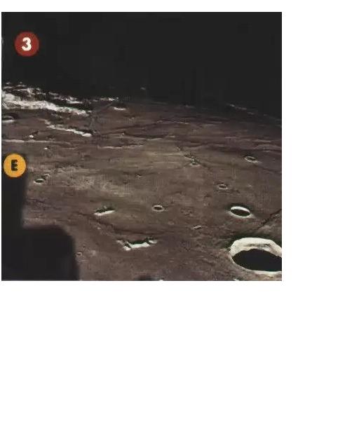 Комментарий к файлу: Америка утверждает, что странная форма (Е) на этом снимке сделанном из Лунного Модуля на высоте 95 км над поверхностью Луны есть тень, отбрасываемая Командным Модулем ракеты. Но когда большие самолеты летят на низкой высоте над землей они не отбрасывают такой громадной и четкой тени.