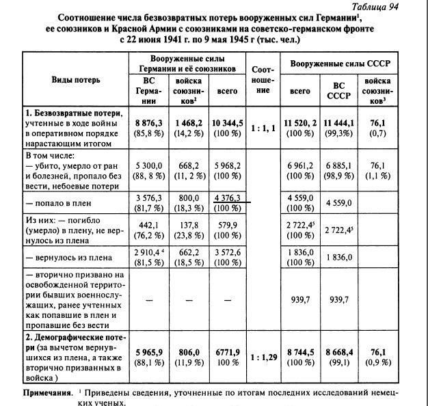 — Если посчитать по результатам всей войны, то даже по самым выгодным для нашего противника оценкам на каждых троих солдат противника приходилось четверо погибших советских солдат. Это вполне пристойный уровень потерь.
