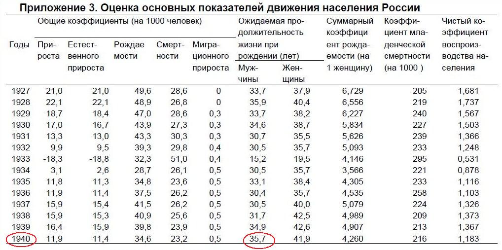 Не нужно врать. Средняя продолжительность жизни мужчины в 1896-97 гг. - 31,3 года. Средняя продолжительность жизни мужчины в 1940 г. - 35, 7.