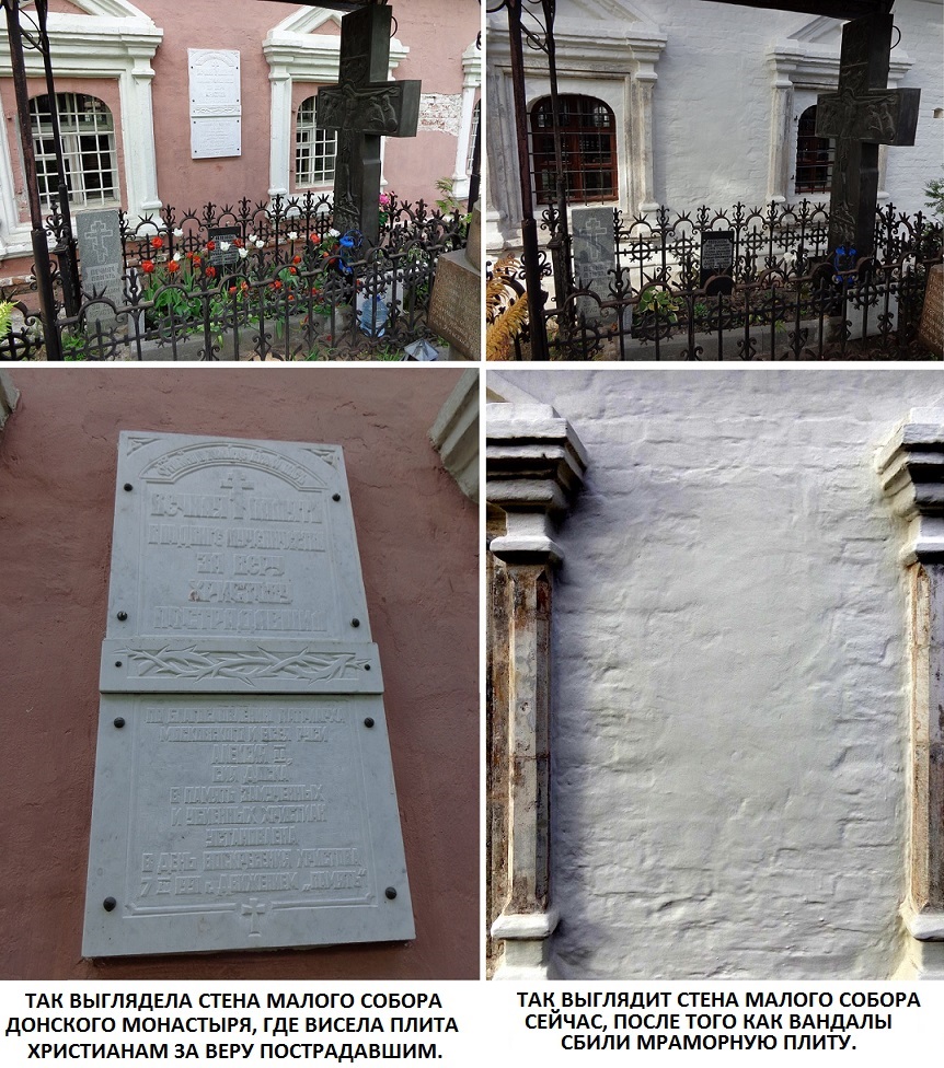 Высокопоставленные церковные и светские чиновники организовали в Донском монастыре публичное осквернение и уничтожение единственной в РФ символической надгробной мраморной доски в честь миллионов Православных христиан, убиенных за Веру. Сбитая и уничтоженная доска была установлена на стене Малого Собора Донского монастыря по благословению Патриарха Алексия II, по инициативе Алексея Полозова - сына Якова Анисимовича Полозова, келейника Патриарха Тихона, убиенного за Веру. В 1924 году Яков Полозов заслонил Патриарха Тихона от пуль наемных бандитов и был после гибели погребен у стены Малого Собора Донской иконы Божией Матери. 25 лет назад (в метре от его могилы) на стене Малого Донского Собора была установлена мраморная доска с текстом "ВЕЧНАЯ ПАМЯТЬ В ПОДВИГЕ МУЧЕНИЧЕСТВА ЗА ВЕРУ ХРИСТОВУ ПОСТРАДАВШИМ. ПО БЛАГОСЛОВЕНИЮ ПАТРИАРХА МОСКОВСКОГО И ВСЕЯ РУСИ АЛЕКСИЯ II СИЯ ДОСКА В ПАМЯТЬ ЗАМУЧЕННЫХ И УБИЕННЫХ ХРИСТИАН УСТАНОВЛЕНА В ДЕНЬ ВОСКРЕСЕНИЯ ХРИСТОВА 7 IV 1991 г.".