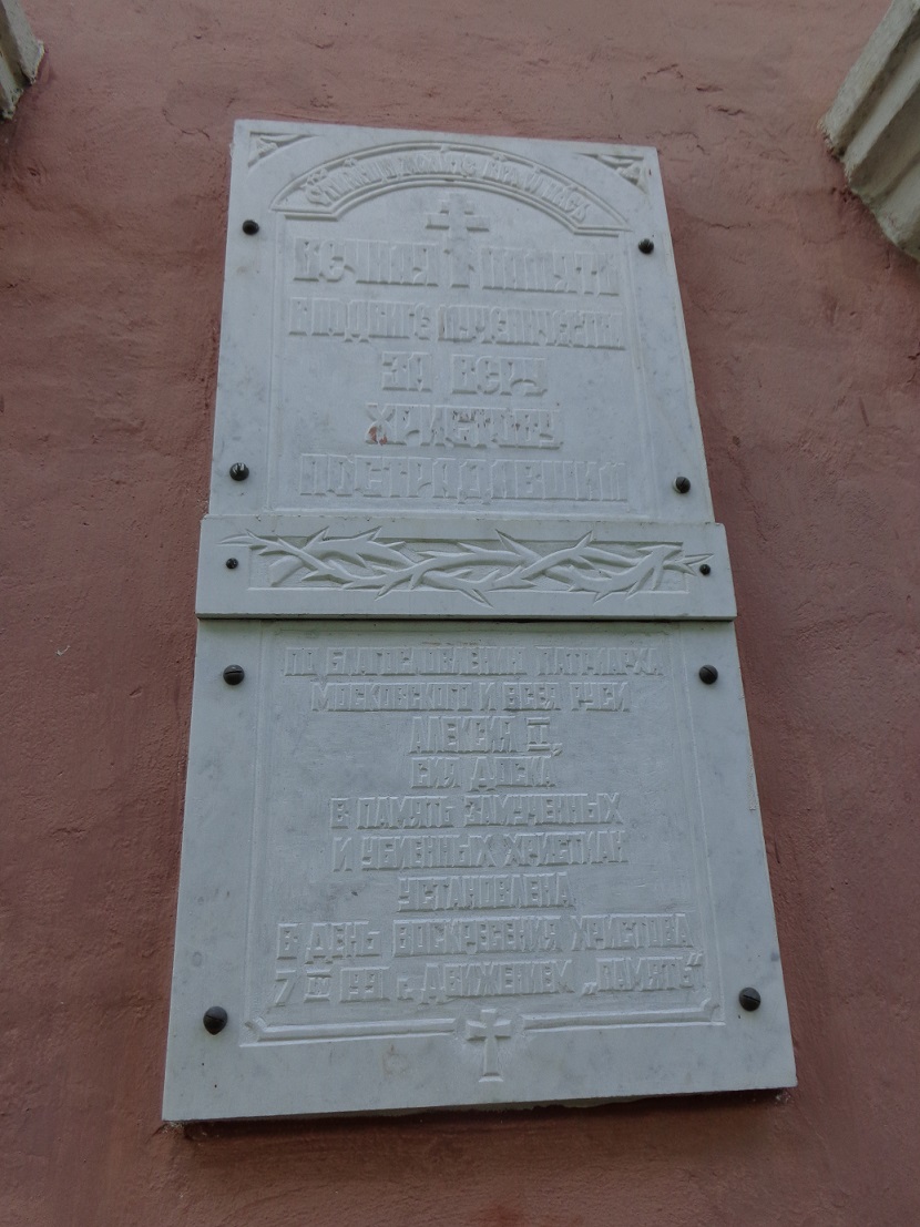 На этом фото запечатлен момент торжественного освящения мраморной доски всем Христианам, пострадавшим за Веру, в настоящее время сбитой и уничтоженной вандалами.