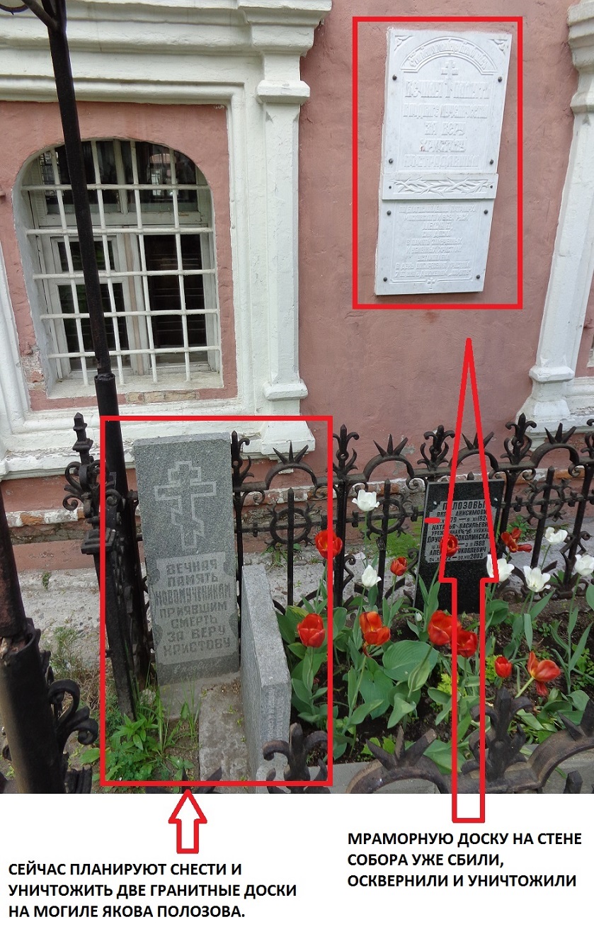 2. Захоронение Новомученика Якова Полозова никто никуда переносить не собирается. Под предлогом "обустройства" и "реставрации" его могилы церковные и светские чиновники намереваются СНЯТЬ И УНИЧТОЖИТЬ ДВЕ ОСТАВШИЕСЯ ПЛИТЫ, воздвигнутые над его захоронением в 1990-91 годах, по инициативе его сына Алексея Яковлевича. (Мраморную доску "за Веру Христову пострадавшим", которая была на стене Малого Собора в метре от могилы Якова Полозова, уже сбили и уничтожили. Теперь в очереди на уничтожение две другие гранитные плиты на самой могиле Якова Полозова.) Об этом сообщила группа прихожан, сославшись на беседу с людьми, приближенными к наместнику епископу Парамону, который по-видимому и был инициатором кощунства.
