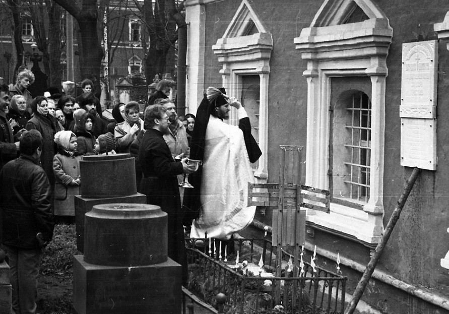 Церемония освящения Святой доски Христианам "в подвиге мученичества за Веру Христову пострадавшим", после ее установки 7-го апреля 1991 года на стене Малого Собора Донского монастыря: