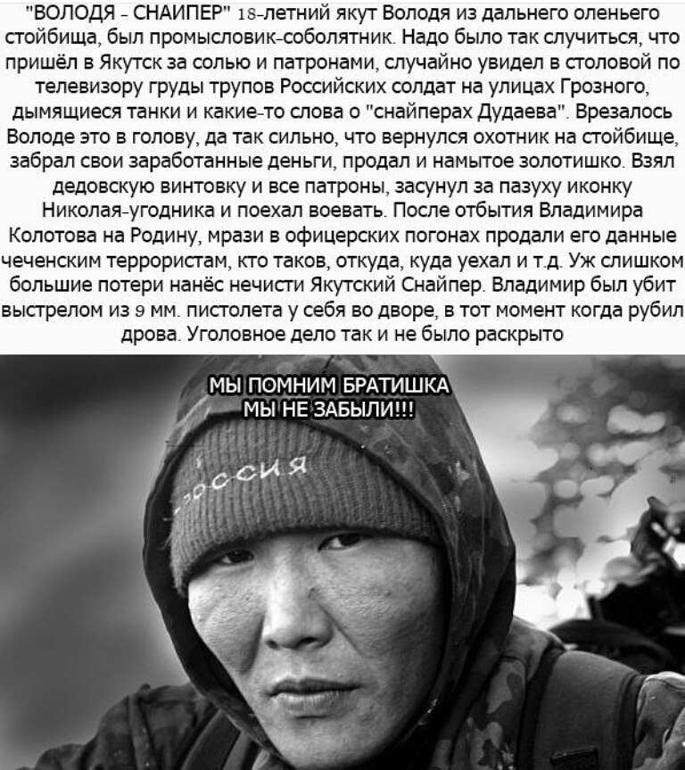 Вот так он и воевал уже третий день. Промысловик-соболятник, 18-летний якут из дальнего оленьего стойбища. Надо было так случиться, что пришёл в Якутск за солью и патронами, случайно увидел в столовой по телевизору груды трупов российских солдат на улицах Грозного, дымящиеся танки и какие-то слова о "снайперах Дудаева". Врезалось Володе это в голову, да так сильно, что вернулся охотник на стойбище, забрал свои заработанные деньги, продал и намытое золотишко. Взял дедовскую винтовку и все патроны, засунул за пазуху иконку Николая-угодника и поехал воевать якут за российское дело.