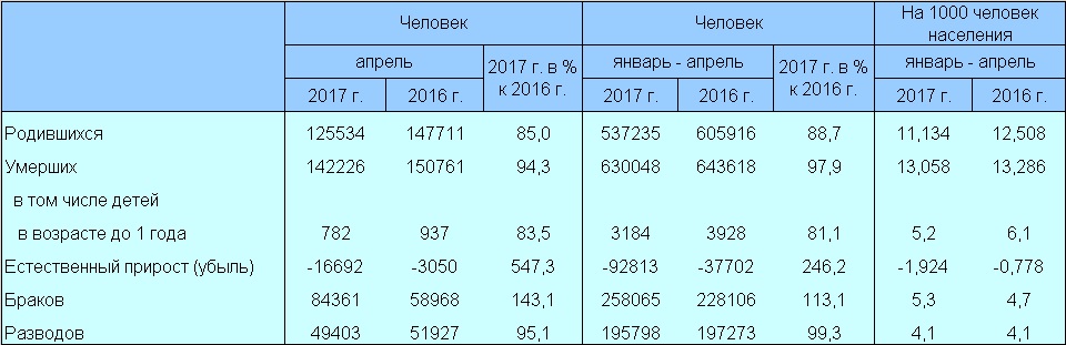 Росстат выложил данные по демографии за январь-апрель 2017 года. Они совершено неутешительные: