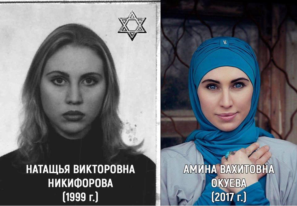 Сначала она превратилась в Анастасию Мустафинову (при заключении первого брака с ичкерийским мушриком в 2000 г.), потом поменяла имя и отчество на Амину Вахитовну, потом стала Окуевой — в 2003 г. заключила брак с очередным муртадом, который использовал поддельный паспорт с этой фамилией. Если первый муж-нацик укатился в Джаханнам вскоре после свадьбы, то второго мужа посадили на пожизненное в зиндан. Третьим мужем стал уже тот самый Адам Осмаев, которого позавчера пытались застрелить в Киеве.