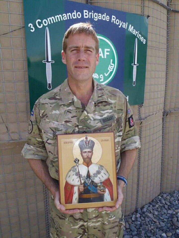 Лашкаргах, провинция Гильменд, Афганистан, 2012 г. Подполковник Джонни Биггарт, руководящий офицер элитного Scots Dragoon Guards, держит икону последнего русского царя Николая II. Русский монарх на момент своей кончины был шефом формирования. Икону полку подарили потомки царской семьи во время перезахоронения останков в Санкт-Петербурге; Scots DG на церемонии были в качестве почётного караула. Подарок сопровождает полк во всех горячих точках и местах применения. Парадная форма полка включает в себя фуражку, чёрный цвет на которой символизирует траур по убитому монарху. На некоторых торжественных трапезах также исполняется "Боже, царя храни".
