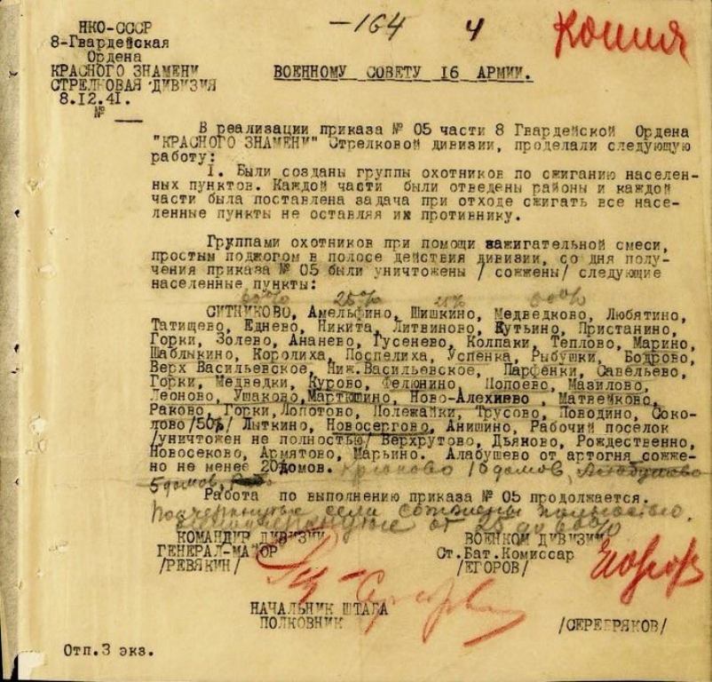 «В селе Семеновское Калининской области немцы изнасиловали 25-летнюю Ольгу Тихонову, жену красноармейца, мать трех детей, находившуюся в последней стадии беременности, при чем шпагатом связали ей руки. После изнасилования немцы перерезали ей горло, прокололи обе груди и садистски высверлили их. В той же деревне оккупанты расстреляли мальчика лет 13-ти и на его лбу вырезали пятиконечную звезду».