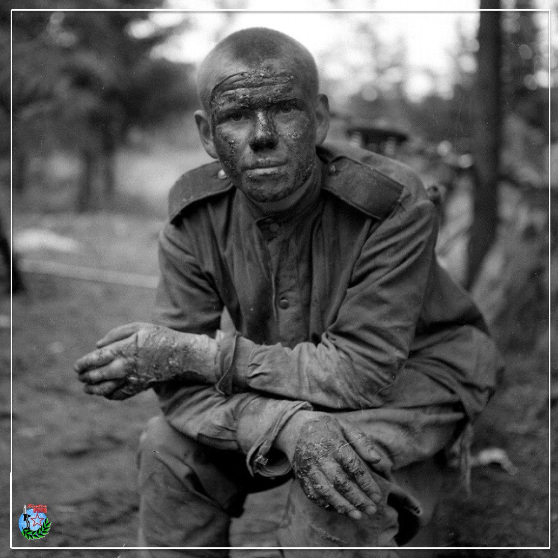 Советский солдат горевший в танке – лицо и руки обгорели, русский Иван.