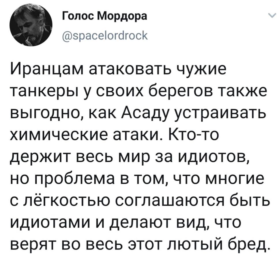 Очевидно, что Иран, мягко говоря, не заинтересован атаковать японские танкеры в момент визита лидера страны восходящего солнца, да ещё и находясь под постоянной угрозой атаки со стороны США. Кроме того на борту танкера Front Altair находилось 12 российских моряков, а не следует забывать, что именно Россия является единственным гарантом существования Ирана и что именно российские и иранские войска воюют в Сирии плечом к плечу против проамериканских марионеток из различных террористических исламистских организаций. Очевидно, что атаковать русских Тегеран не согласится ни за что.