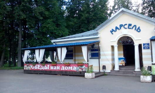 Кафе на берегу Русской реки Волги в Русском городе Рыбинске. С каких-то рыжиков местные смердяковы обозвали его «Марселем»! Ну какое отношение Рыбинск и Волга имеют к Марселю, век бы его не видать!?! Специально зашёл внутрь. Зонтики висят, типа марсельский интерьер...