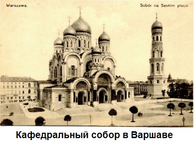 Самым вопиющим деянием польской власти в первые годы независимости стало уничтожение величественного кафедрального православного собора св. Александра Невского в центре Варшавы. История его строительства и варварского уничтожения вкратце такова. Мысль о необходимости строительства Православного кафедрального собора в Варшаве высказал незадолго до того вступивший в должность генерал-губернатора И.В. Гурко, герой Русско-турецкой войны 1877-1878 годов. По его словам все тогдашние Православные храмы Варшавы могли вместить лишь около одной десятой православных жителей города. Гурко направил специальную записку на Высочайшее имя, и она получила одобрение у Императора Александра 3-го. Значительную часть средств на строительство собора составили добровольные пожертвования со всей России, включая Императорскую Семью. 28 августа 1893 г. был создан особый Комитет по строительству собора, возглавляемый И.В. Гурко, и объявлен конкурс на лучший проект, каковым была признана работа Л.Н. Бенуа, утверждённая Александром 3-м 13 января 1894 г. В том же году началось и само строительство на Саксонской площади. Рядом с храмом была заложена 70-метровая соборная колокольня, вершина которой стала самой высокой точкой города.