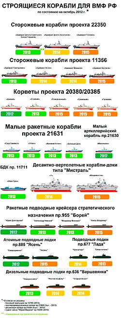 Призыв Владимира Путина к модернизации российских вооруженных сил нашел особый отклик в Главном штабе ВМФ. Хотя российская инфраструктура кораблестроения продолжает страдать от недостатков и изъянов (о чем говорится ниже), есть масса свидетельств, говорящих о том, что Россия снова активно взялась за строительство кораблей. Сообщение «РИА Новости» о том, что российский ВМФ получит в 2013 году 36 боевых кораблей, является преувеличением, потому что в это количество включено несколько малых судов и катеров; и тем не менее, когда речь заходит о модернизации российского флота, все показатели указывают на подъем. Объявленная российским правительством сумма ассигнований в четыре триллиона рублей (132 миллиарда долларов), которая будет выделена до 2020 года на новые корабли и подводные лодки, составляет примерно четверть от общей суммы на закупки вооружений. Чтобы получить представление о серьезности российских намерений, следует отметить, что это в несколько раз больше того, что выделялось в бюджете на кораблестроение в предыдущие годы, и примерно половина того, что выделяют на эти цели Соединенные Штаты. В последние двадцать лет российские децентрализованные и устаревающие кораблестроительные заводы преимущественно строили корабли и подводные лодки на экспорт. Одиночные российские корабли могли стоять на стапелях перед вводом в действие на протяжении десяти лет и больше. Сегодня Россия закрыла свои мелкие верфи, а оставшиеся предприятия объединила под централизованным управлением.