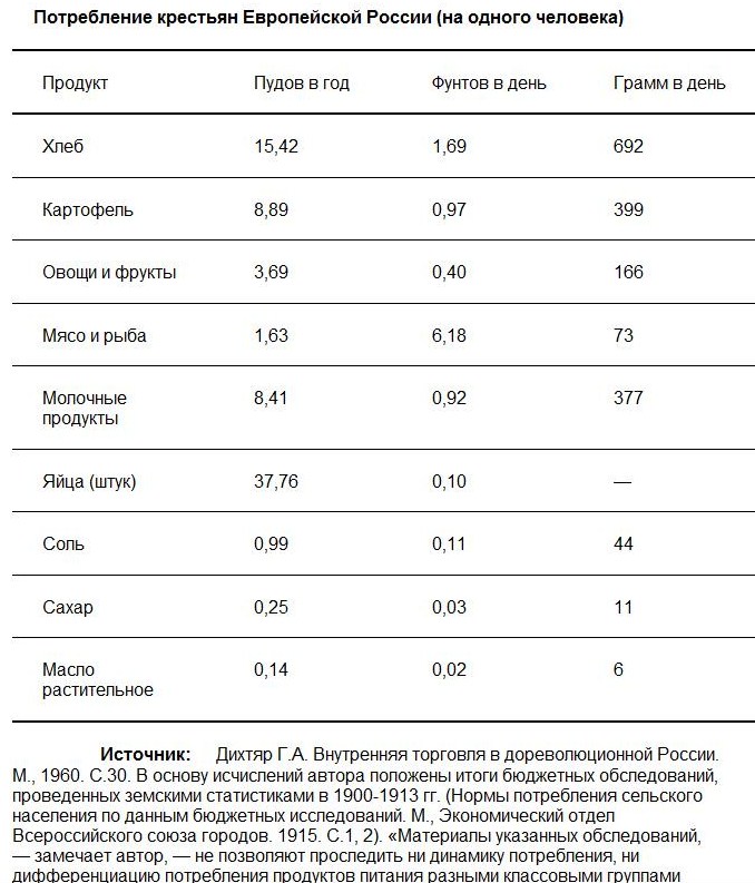 Не учили вас в гимназии прилежанию, поверхностно ко всему относитесь. Как это "непонятные мясные продукты? Например, мясные продукты во Франции да и в других странах подрузумевают и само сырое мясо,а также и колбасы, и прочие копчености всякие. Русскому крестьянину ,понятно, это все было ни к чему, поэтому эти излишества кушали у нас преимущественно только достойные дворяне, купцы и разночинцы немецкого и французского и прочего просвещеннго происхождения. И молочные продукты тоже вместе с куриными яйцами. А по второй таблице видно, что и инородцы империи - финны тоже много ели животной пищи. Русских крестьян и рабочих, видимо, избавляли от излишеств. Как там написано под таблицей:"...минимум недосягаемый ни для русского крестьянина, ни тем более, для русского рабочего."