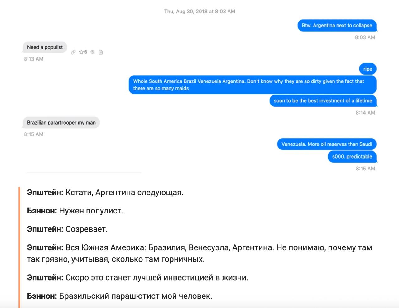 Но через три недели у Эпштейна с Бэнноном состоялся еще более загадочный обмен реплик по теме Южной Америки: