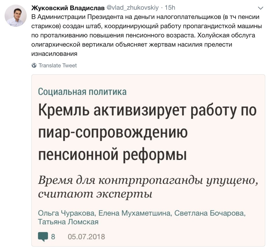 Кремлёвским холуям и лизоблюдам поставлена задача убедить население РФ, в 90% отвергающее путино-медведевский пенсионный геноцид, что людям якобы полезно жить и помирать на старости лет и без пенсии и без работы.