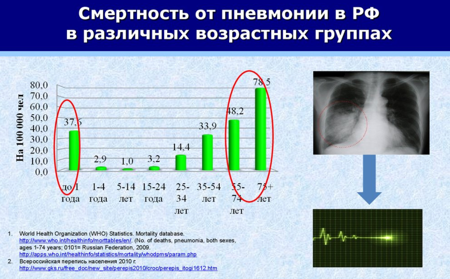 У людей среднего возраста уже есть специфический иммунитет и еще относительно здоровая дыхательная система, поэтому пневмонией они болеют реже и переносят ее относительно легко, а вот у стариков легкие уже сильно изношены, поэтому пневмония протекает у них в более тяжелой форме. Где-то попадались цифры, что вклад пневмонии в смертность от респираторных заболеваний – 42%. Но в данном случае нам интереснее не проценты, а количество свидетельств о смерти, в которых воспаление легких указывается в качестве причины летального исхода. Согласно данных Росстата таковых в 2014 г. было 39 тыс. случаев, в 2016 г. умерла 31 тысяча человек. Почему никто не паникует из-за таких громадных цифр? Да потому, что команды «Сидеть-бояццо!» по зомбоящику идиоты не получили. Кстати, врачи не первое десятилетие талдычат: смертность от пневмонии можно снизить на 80%, регулярно прививаясь от гриппа. Однако добровольно это делает 1,5-2% населения.