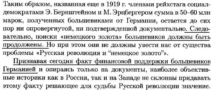 А товарищам местным большевикам я хочу сообщить, что они поспешили радоваться кристальной чистоте внука Израиля Бланка. Доказательства получения денег большевиками базируются не только и не столько на "документах Сиссона". Вот, например, официальная позиция питерских историков. Не каких-то интернет- болтунов, а настоящих профессиональных историков. Книга преподавателя истфака СПбГУ Г.Л. Соболева назывется "Тайный союзник. Русская революция и Германия 1914-1918" (СПб, Издательство Санкт-Петербургского университета. 2009 -- 476 с.) Рецензент - завкафедры новейшей истории России СПбГУ, доктор истоических наук М.В. Ходяков. Так вот, цитата оттуда. Подчеркну - это официальная позиция современной, самой что ни на есть, официальной исторической науки. Поэтому она смягчается уверениями насчет "объективности" революции, но факт остается фактом - по мнению соверменных историков Германия оказывала большевикам финансовую поддержку.