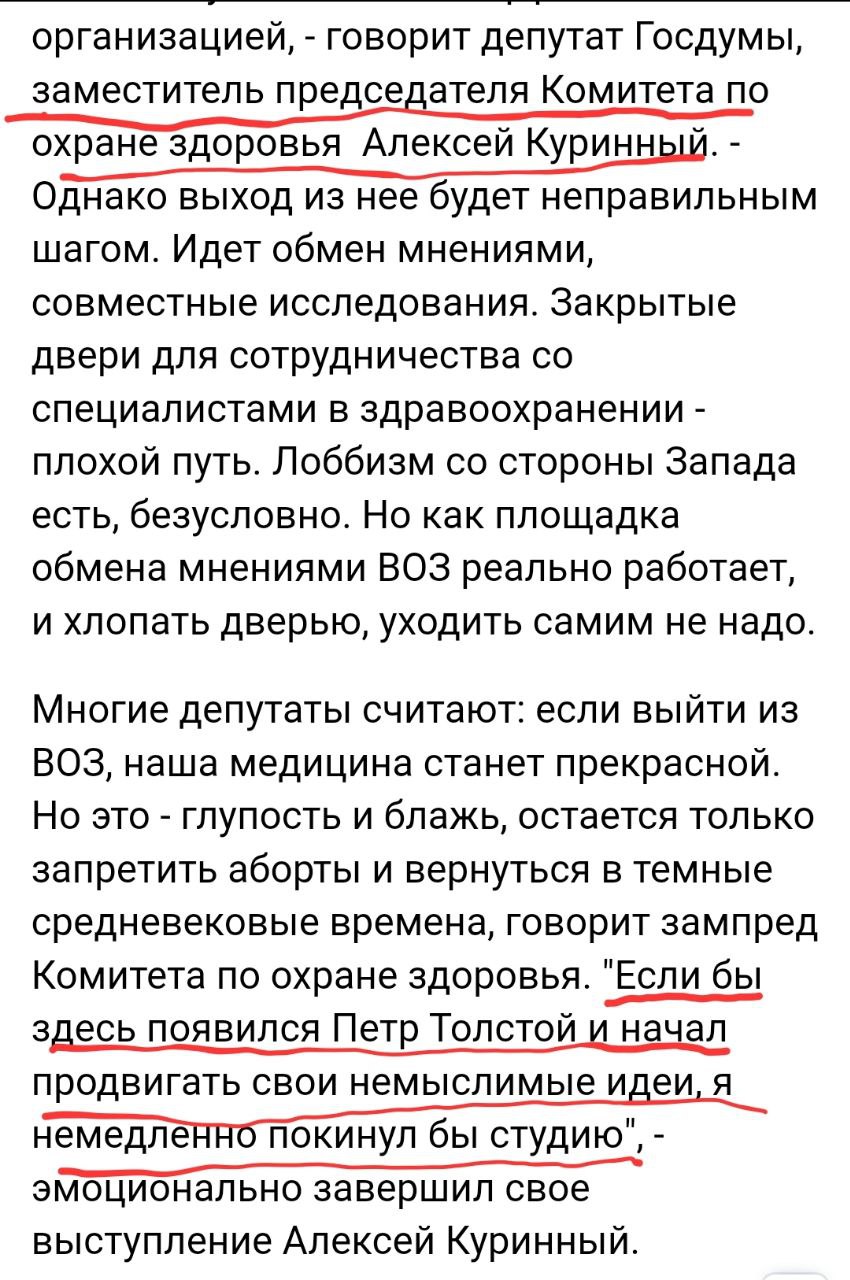 Обсуждение выхода из ВОЗ. (https://mk-ru.turbopages.org/turbo/mk.r ... blazh.html) Внезапное от депутата Куринного, зам комитета по здравоохранению ГД.