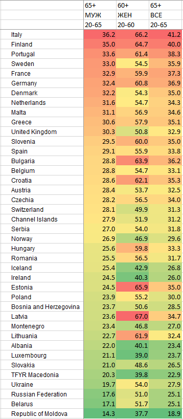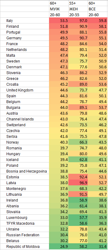 Пенсионная нагрузка в России самая низкая в Европе для мужчин, ниже только Молдавия. Так, например, в России 30,4 мужчин возрастом старше 60 лет на 100 человек мужчин в диапазоне 20-60 лет. В Италии 53.5, в Португалии и Германии по 50, т.е. на каждого пожилого приходится двое молодых в трудоспособном возрасте, а в России 3.3 человека, что в 1.65 раза больше. С женщинами лучше. В России 76 женщин старше 55 лет на 100 женщин в возрасте 20-55. Это на уровне Польши и Швеции. Самая высокая нагрузка в Италии и Латвии, где практически 1 к 1. Если взять все население, то в России 41 пожилых (старше 60 лет) на 100 человек в возрасте 20-60. Это значительно ниже, чем в странах Европы, где обычно 50+, а выше всего в Италии (59,8).